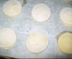 Z calego ciasta wycinamy kòlka, musza byc wszystkie do pary. Niektòre pieczemy luzem- te na foremkach ,na zdjeciu - po upieczeniu i wystygnieciu beda z bita smietana. Inne napelniamy przed pieczeniem - kòlko, nadzienie, zamykamy drugim kòlkiem, cos jak okragle pierozki ( jesli zle sie sklejaja, brzeg wewnetrzny kòlek posmarowac woda, wtedy sie dobrze skleja ). Jesli jeszcze sa problemy, prosze pytac