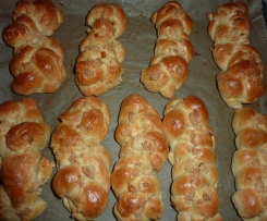 Do naczynia wlewamy mleko i podgrzewamy czas 1 minuta/ 50 st/ obr.2. Nastepnie dodajemy drożdże i 1 łyżkę cukru, mieszamy czas 15 sek, obr.2. Odlewamy do innego pojemniczka, następnie nie myjąc naczynia wkładamy masło i rozpuszczamy czas 30 sek/ 60 st/ obr.2. Dodajemy mąkę, cukier, cukier waniliowy, sól, jajka i mleko z drożdzami oraz skórkę i wyrabiamy ciasto czas 2 min/ Interwał. Wyrobione ciasto przekładamy do miski i smarujemy lekko olejem (dłońmi) i zostawiamy do wyrośnięcia na 2 godzinki, w tym czasie nalezy 2 razy odgazować wbijając w nie pięść. Jak wyrośnie to formujemy z ciasta 9 kulek i pleciemy z każdej wałek, który dzielimy na 3 części i splatamy w warkocz, tak samo ze wszystkimi kawałkami ciasta. Odstawiamy jeszcze na 30 minut i przykrywamy folią. Smarujemy rozbełtanym jajkiem z wodą i posypujemy kruszonką. Pieczemy w nagrzanym piekarniku przez 25 minut w temperaturze 180 stopni.