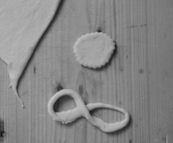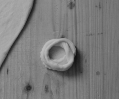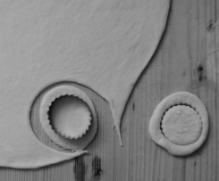7.Wyrośnięte ciasto rozwałkować.Wykrawać szklanką okrągłe placuszki,drugą,mniejszą szklanką (lub foremką)wykrawać w placuszku drugi placuszek.Powstała obwódkę składać w 8.Ułożyć rancik na mniejszym placuszku.
