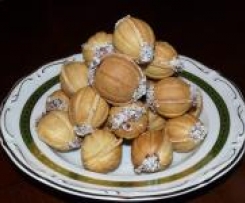 "Ciasto" . Ciasto schłodzić przez około 2 godziny w lodówce. Po wyjęciu upiec w formie do orzeszków. Orzechy włoskie zmielić w naczyniu miksującym 3 sek. obr. poz 5., przełożyć do innego naczynia, a następnie zalać gorącym mlekiem, wystudzić. Do czystego naczynia założyć motylek, wbić jajka i dodać cukier. Ubijać przez 5 minut obr. poz. 3. temperatura 60 stopni. Wyjąć motylek, a masę wystudzić. Do zimnej masy jajecznej dodać masło i ucierać 5 minut obr. poz. 4. Pod koniec ucierania dodawać przez otwór w pokrywie zmielone, zaparzone mlekiem i wystudzone orzechy. Masę wstawić do lodówki do stwardnienia. Będzie się wtedy lepiej nakładało do upieczonych połówek. Napełniamy połówki masą a następnie sklejamy. Można udekorować maczając końcówki orzeszków w polewie czekoladowej, a następnie w kokosie.