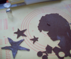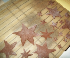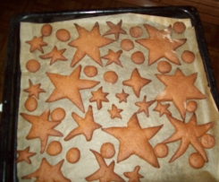 Małym nożykiem wykrawamy gwiazdki różnej wielkości ( wcale nie muszą mieć bardzo regularnych kształtów), natomiast małym kieliszkiem wykrawamy kółeczka. Całość układamy na blasze wyłożonej papierem i wkładamy do nagrzanego piekarnika o temp. 180 stopni. Pieczemy ok. 15 min.
