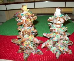 Na podstawę choinki wybieramy największą gwiazdkę. Mocujemy na środku patyczek, smarujemy odrobiną lukru i nakładamy kółeczko i podobnie - smarujemy lukrem ,nakładamy mniejszą gwiazdkę i kółeczko itd…aż do uformowania drzewka.