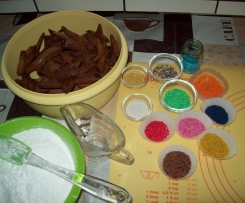 Tak przygotowane drzewko polewamy obficie lukrem (zaczynając od wierzchołka). W momencie kiedy lukier zaczyna zastygać obsypujemy choinkę kolorową posypką .Na czubku przyklejamy lukrem udekorowaną , najmniejszą gwiazdkę.