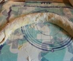 Ciasto podzielić na dwie części, rozwałkowac na prostokąt, rozłożyć połowę farszu, można posypać cynamonem i zawinąć jak roladkę, przełożyć na blaszkę wyłożoną papierem do pieczenia formując w kształt rogala. Posmarować białkiem i posypać cukrem.