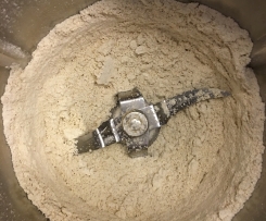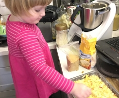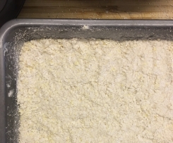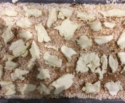 "Blokada naczynia miksującego" , otrzymaną mieszankę, ważymy (np. używając wagi w TM) i dzielimy na 3 równe części (u mnie ok 130 g jedna). - Blaszkę (u mnie 34x20), smarujamy masłem.