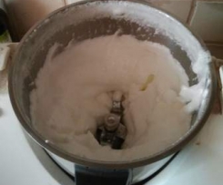 wlac białka i dodać cukier czas 1-2 min / obr. 4. Dodać mąkę ziemniaczaną i proszek do pieczenia. Wyjąć motylek. Przygotować trzecią blaszkę z papierem wysmarowaną tłuszczem. Na blaszkę wykładać kupkami na przemian cztery masy biszkoptowe.