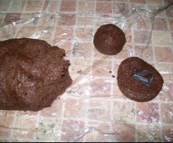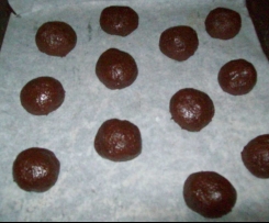 "Blokada naczynia miksującego" wlozyc margaryne i cukier: 15sek / obr 5. Dodac jajko, maki, kakao i proszek: 30sek / obr 5. Zawinac w folie, wlozyc do lodòwki na 1h. Podzielic na kulki wielkosci moreli, rozplaszczyc, wlozyc kostke czekolady, uformowac kulke. Ukladac na blaszce, w sporych odstepach. Piec w nagrzanym piekarniku: 180° / 10min ( nie przekraczac zbytnio czasu, bo wyjda za kruche).Ciasto jest dosc klejace.