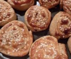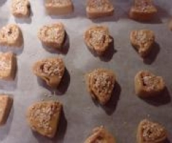 Ciasto podzielić na dwie części, rozwałkować jedną, posmarować masą kajmakową i posypać połową orzechów, ciasto zawinąć jak roladę, pokroić na kawałeczki i przełozyć na blaszkę wylożoną papierem do pieczenia. Posmarować pozostałym białkiem i posypać sezamem.