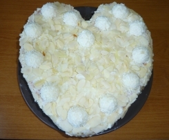 Biszkopt przestudzić, przekroić na pół wzdłuż.Biszkopt nasączyć esencją herbacianą wymieszaną z 3 łyżkami nalewki wisniowej lub innym alkoholem, psmarować dzemem porzeczkowym i wyłożyć 2/3 kremu, nastepnie przykryć drugim płatem biszkopta i zrobic na wierzchu małe dziurki nożem i nasączyć, wyłozyć resztę kremu rozsmarowując także po bokach. Wierzch ciasta posypac pozostałymi migdałami, każdą kulkę rafaello przekroić na pół i ułozyć na cieście. Schlodzic w lodówce.