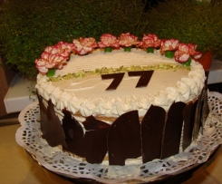 Dekoracja, to też pole do popisu - ja użyłam świeżych goździków "konserwowanych" żelatyną, pistacji oraz łamanych płatków czekolady (rozpuszczoną czekoladę rozsmarowałam na pergaminie, włożyłam do lodówki a następnie polamałam w takie nierówne płytki).