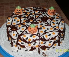 Przygotowac krem: w czystym garnku wymieszac - 120g margaryny, 200g cukru pudru, 30g gorzkiego kakao i 1 lyzke bardzo goracej wody; 20- 30sek obr 4- 5 ( do otrzymania gladkiej masy ). Otrzymana masa przelozyz upieczone i wystygniete placki, zostawiajac troche kremu do pokrycia powierzchni i bokòw ciasta. Dekorowac w zaleznosci od okazji, upodobania i... humoru