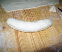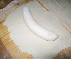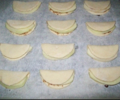 "Blokada naczynia miksującego" wlozyc polowe skladnikòw na ciasto: 25sek / obr 5. To samo robimy z druga porcja. Poniewac ciasteczek wyjdzie duzo (80-90 szt., trzeba robic na 2 razy). Laczymy oba ciasta, wkladamy do lodòwki na 30min. Rozwalkujemy, wycinamy krazki z 2/3 ciasta. Na 1/3 nakladamy nutelle, zamykamy jak pierogi. Na pozostala 1/3 , posypujemy cynamonem i nakladamy jablko, zamykamy bez dociskania ( jablka nalezy obrac, wyczyscic, pokroic na 4 czesci; kazda czesc pokroic na 4-5 plastròw). Pozostaje nam jeszcze ostatnia czesc ciasta. Rozwalkujemy, kladziemy obrany ze skòrki banan, odcinamy kawalek ciasta potrzebny do "obklejenia " banana, lekko skropimy sokiem z cytryny ( nie bedzie mdle po upieczeniu), formujemy wszystko na ksztalt banana, zakrywajac go ciastem z kazdej strony. Nacinamy w 5-6 miejscach, kròre zaraz po upieczeniu przekroimy do konca. Pieczemy ciastka w goracym piekarniku: 180° / do zrumienienia. Posypujemy cukrem pudrem.