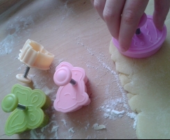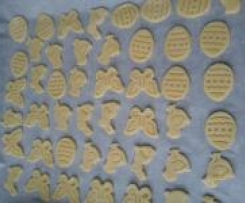 3. Po tym czasie rozwałkowujemy ciasto i wykrajamy ciasteczka. Układamy na wyłożonej papierem blaszce.