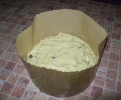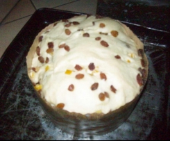 "Ciasto" . Wyjac, dodac rodzynki i skòrke, wymieszac. Ciasto wlozyc do formy, zostawic do wyrosniecia, az dojdzie do brzegòw foremki. Piec w nagrzanym piekarniku: 180°, do calkowitego upieczenia ( 40min, 1h, zalezy od piekarnika). Zostawic w piekarniku do ostygniecia.Jesli ciasto za szybko sie piecze z wierzchu, przykryc papierem aluminiowym. Sprawdzac dlugim patyczkiem czy jest suche w srodku, czyli gotowe. Jest to tradycyjne, klasyczne wloskie panettone. Inne wersje moga byc wg gustòw- z kawaleczkami czekolady w srodku i z czekoladowa polewa; zwykle polukrowane i ozdobione platkami migdalowymi....