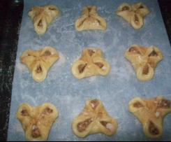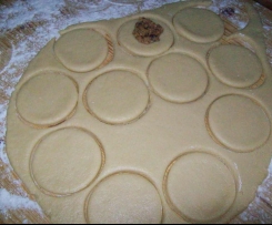 "Blokada naczynia miksującego" wlozyc wszystkie skladniki: 1 min / obr 5. Zawinac w folie, wlozyc do zamrazalnika na 10-15min. Rozwalkowac na grubosc ok. 5mm, wycinac krazki 8cm, az do wykonczenia ciasta. Na srodek nakladac ok. lyzeczki nadzienia, zamknac , jak na zdjeciu- 3 brzegi. Ulozyc na blaszce, posmarowac jajkiem, posypac cukrem cynamonowym. Piec w nagrzanym piekarniku: 190° / ok. 10-15 min, do zrumienienia. Wyjac, wystudzic.Nadzienie: