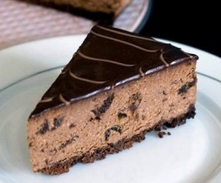 Masę serową przelać na ciasteczkowy spód i piec w kąpieli wodnej* w temperaturze 150ºC przez około 60 - 70 minut (lub dłużej, w zależności od piekarnika). - W małym garnuszku podgrzać śmietanę kremówkę, prawie do wrzenia, zdjąć z palnika. Zalać nią posiekaną czekoladę, odstawić na 2 minuty. Po tym czasie wymieszać do powstania gładkiego sosu czekoladowego. Rozprowadzić na upieczonym przestudzonym serniku.