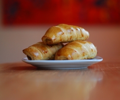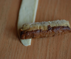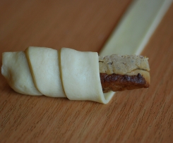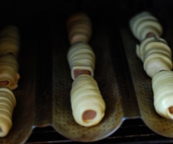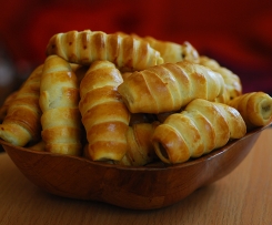 Twardy, pieczony pasztet kroimy na porcje ok. 5cm długości, 1cm grubości i 1cm szerokości. Układamy pasztet na końcu paska ciasta i zwijamy (patrz foto). Tak zwijamy wszystkie paszteciki - z tej porcji ciasta powinno wyjść ok 20szt. Układamy je na blaszce do pieczenia. Smarujemy rozbitym jajkiem, można posypać kminkiem, solą, serem żółtym (w zalezności kto co lubi). Ułożone dosyć luźno na blaszce do piecznia wkładamy do rozgrzanego piekarnika na 15 min. Można je podawać na ciepło i na zimno np. z barszczem.