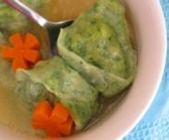 "Ciasto" . Wyjmujemy ciasto na stolnicę. Nastawiamy wodę w garnku. Ciasto należy rozwalkować bardzo cienko, nastepnie pociać na kwadraty o długości boku około 4 cm. Na kwadracie kładziemy farsz, zginamy po przekątnej i łączymy dwa rogi. (Jak uszka do barszczu). Tortellini gotujemy w osolonej wodzie, od czasu do czasu mieszając drewnianą łyżką, przez 3-4 minuty od momentu wypłyniecia na wierzch. 4. Tortellini podajemy w gorącym rosole.