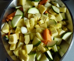Do naczynia wlać 1 litr wody i założyć koszyczek, wsypać soczewicę. Do przystawki Varoma włożyc warzywa pokrojone na kawałki, cukinię dodajemy ze skórką (jak mamy młodą i małą).