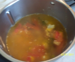 Na patelni rozgrzać olej , dołożyć rozdrobnione składniki. Podsmażyć ok. 10 min. Następnie zawartość patelni umieścić w naczyniu, dolać wody, dodać trochę soli ,pieprzu - gotować 10 min.,temp. 100 stopni, obr.2. Minutę przed końcem gotowania wszystkie składniki zmiksować obr.10.