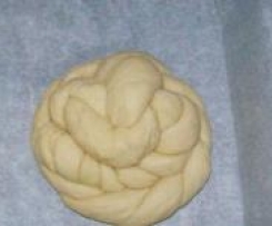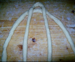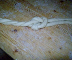 Te 2 "sznureczki" ciasta, zewnetrzne, wchodza w dziurke i robi sie supelek. Potem konce skrecasz i wszystko okrecasz dookola, chowajac leciutko konce pod spòd