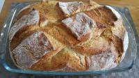 - Wyjąć na posypany mąką blat i uformować bochenek. Ostrym nożem maczanym w wodzie ponacinać wierzch bochenka. Piec w nagrzanym naczyniu żaroodpornym 40 min 210ºC. Po tym czasie odkryć pokrywę i dopiec ok 10 min.