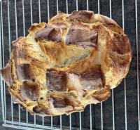 - Wyjąć na posypany mąką blat i uformować bochenek. Ostrym nożem maczanym w wodzie ponacinać wierzch bochenka. Piec w nagrzanym naczyniu żaroodpornym 40 min 210ºC. Po tym czasie odkryć pokrywę i dopiec ok 10 min.