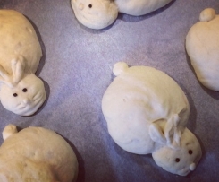 "Ciasto" , a następnie przekładamy ciasto na stolnicę, zagniatamy w kulkę i wkładamy do miski wysmarowanej cienko tłuszczem. Miskę przykrywamy i odstawiamy w ciepłe miejsce** na 45min (ciasto powinno znacząc urosnąć). - Wyrośnięte ciasto przekładamy na stolnicę wysypaną cienko mąką i dzielimy na 7-8 części - każda część będzie potrzebna do przygotowania jednego zajączka (tj. jednej bułki).