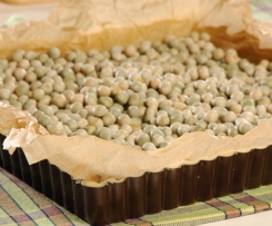 - Ciasto w formie nakłuć widelcem, przykryć papierem do pieczenia, posypać suszonym grochem, piec w piekarniku przez 15 minut w temperaturze 180°C.