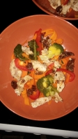 - Mięsko kroje w paseczki solę , pieprzę , mieszam z posiekanymi pomidorkami suszonymi (6sek obr6), kurczaka daję do koszyczka, do naczynia wlewam 1l wody, na waromie ukladam marchew brokuł, paprykę , po marchwi wyciskam cytrynę, nastawiam czas, 20min waroma, po wszystkim marchew daję jak makaron, na to warzywka i mięsko, wszystko posypuję ziołami (z umiarem) pycha, dzieci się zajadają , i naprawdę obiad jest bardzo syty .