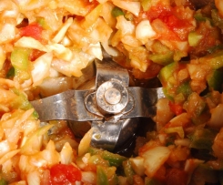 - Do naczynia miksującego wlać oliwę extra virgin, dodać zieloną paprykę, cebulę, pomidory i czosnek, rozdrobnić 4 s/obr. 4, dusić 7 min/Varoma/obr. 1.