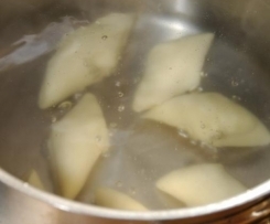 2. Podzielić ciasto na części, na nie klejącej się powierzchni uformować wałki (Ø 2 cm). Pokroić na kawałki o grubości 1-2 cm. Do gotującej się wody wsypać 2 łyżeczki soli, gotować pierogi 7-8 minut. W międzyczasie przygotować dodatki.