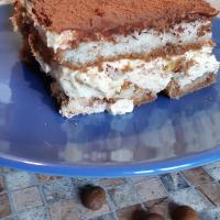 - Kawę wymieszać z amaretto. Biszkopty namoczyć w kawie, wyłożyć nimi dno prostokątnego naczynia (15x20 cm), wyłożyć połowę kremu, na wierzchu ułożyć kolejną warstwę biszkoptów, wyłożyć resztę kremu.