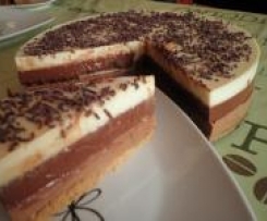 "Blokada naczynia miksującego" dodajemy 1/2 l tej mieszanki,150 gr.czekolady gorzkiej,100 gr.cukru,1 torebke zelatyny w proszku 7 min./90stopni/poz.5.Wylewamy na spod przygotowany z ciastek i masla,schladzamy. Przygotowujemy kolejna warstwe z czekolady mlecznej i 50 gr. cukru w ten sam sposob,tyle ze wylewajac podstawiamy lyzke stolowa aby nie lalo sie bezposrednio na poprzednia warstwe.Schladzamy. Myjemy dobrze