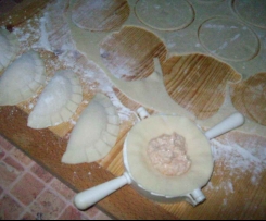 "Ciasto" . Wyjac, wyrobic troche rekoma, dodac maki, ile potrzeba. Ciasto musi byc elastyczne, miekkie. Rozwalkowac ciasto, wykrawac krazki, nakladac nadzienie, sklejac. Gotowac w osolonej wodzie. Przygotowac okrase: na malej patelni rozpuscic margaryne, dodac szalwie, po kilku sekundach zdjac z ognia. Polac pierogi, posypac parmezanem, nastepnie orzeszkami.