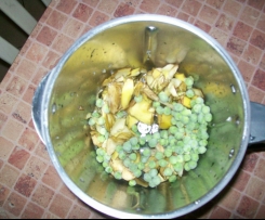 Zmielic parmezan:10 sek /obr 8, odlozyc na bok. Zmielic pietruszke z cebulka: 5 sek /obr 7. Zebrac ze scianek, dodac olej, karczochy, groszek, rosòl, sòl, pieprz :20 min /100° /