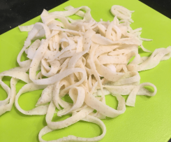 - Z naleśników możecie przygotować w łatwy sposób makaron (do zupy lub do podania z sosem) – wystarczy ciasno zrolować naleśniki, a następnie pociąć je na cienkie ślimaczki. Po “rozplątaniu” wszystkich ślimaczków makaron wygląda mniej więcej tak: