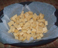 "Blokada naczynia miksującego" wlac 1000g wody, na Varomie polozyc papier kuchenny, na nim ser, pokrojony na male kawalki: 40-45min / Varoma / obr 1. Wyjac ser, rozwalkowac, rozprowadzic na nim farsz grzybowy, zwinac w rulon, zostawic do calkowitego wystygniecia, kroic na plastry. Jesli chcemy, by ser rozpuscil sie szybciej, rozdrabniamy go z grubsza w TM i bedac drobniejszy, na Varomie rozpusci sie w kròtszym czasie ( ok. 30min).