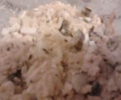 Do suchego naczynia włóż :ugotowany ryż,pokrojone w kostkę jajka i ogórki(ja kroiłam ręcznie) ,rozdrobnioną rybę, warzywa,majonez i odcedzoną kukurydzę.Dodać ulubione zioła (ja dołożyłam tymianek i prowansalskie) Wymieszać 30sek/