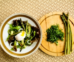 Przygotować jajka w koszulkach. Do garnka wlać około 1 litra wody i zagotować dodając 1 - 2 łyżeczki octu winnego lub soku z cytryny (opcjonalnie) oraz szczyptę soli. Ustawić umiarkowany ogień. Do miseczki wbić jajko i delikatnie wylać je do gotującej się wody (wodę wcześniej zamieszać i utworzyć wir). Gotować przez około minutę, wyjąć łyżką cedzakową i ocenić czy całe białko jest już ścięte, żółtko natomiast ma pozostać płynne. Na gotowej sałatce położyć jajko, doprawić solą, pieprzem. W razie potrzeby polać dodatkową oliwą. Podawać z pieczywem, przed jedzeniem sałatkę można delikatnie przemieszać.