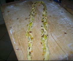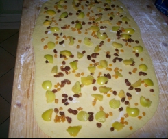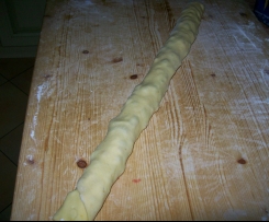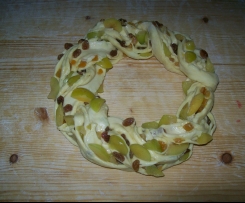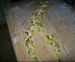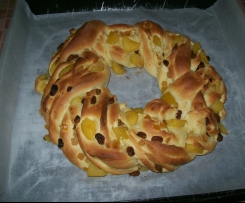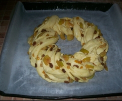 "Ciasto" . Rozwalkowac na cienki prostokat ( albo 2 mniejsze), porozkladac rodzynki uprzednio namoczone w alkoholu i odcisniete, skòrki pomaranczowe, kawalki sliwek ( mozna posypac cukrem, jesli sliwki sa bardzo kwaskowe). Zwinac w rulon, zamknac 1 koniec, walek rozciac na pòl. Splesc w wieniec, polozyc na blaszke do wyrosniecia ( az podwoi objetosc). Piec w nagrzanym piekarniku: 175-180° / okolo 25-30min. Czekolade rozpuscic w wodnej kapieli, polac ciasto.