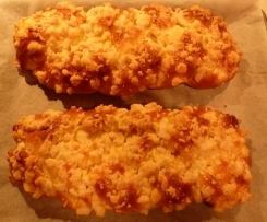 Chałki smarujemy rozbełtanym jajkiem, wyjmujemy z lodówki kruszonkę i rozdrabniamy ją palcami lub widelcem i posypujemy chałki.
