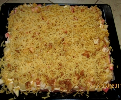 Po wyciagnieciu większą czesc rozwalkowac na blaszcze o wymiarach 30x35 (u mnie duza blacha od piekarnika- jesli macie mniejsze blaszki zrobcie z polowy porcji). I upiec w piekarniku nagrzanym do 190st - około 10 minut- do uzyskania złotego koloru. Ciasto odstawic do wystudzenia.
