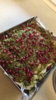 Na spodni blat dajemy bitą śmietanę, wyrównujemy warstwę, posypujemy okruchami ciasta i dekorujemy pestkami granatu lub borówkami. Leciutko dociskamy dłonią.