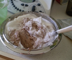 4. ciasto wyjąć do miski, dodać pianę i groszki czekoladowe, lekko wymieszać