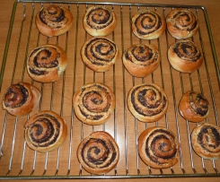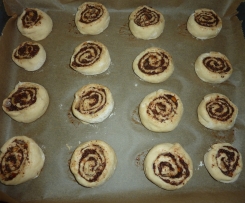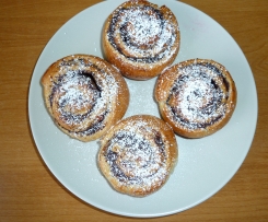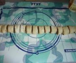 Po dwóch godzinach ciasto przełozyć na podsypaną mąką stolnicę, podzielić na 2 części, jedną rozwałkować na cieńki placek owalny, posmarować połową masy, zawinąć jak roladkę, pokroić na kawałki - z jednej porcji wychodzi 14-16 części. Bułeczki układać na blaszkę wyłożoną papierem do pieczenia przekrojoną stroną do dołu i lekko spłaszczyć dłonią, posmarować rozbełtanym jajkiem. Tak samo zrobić z drugą porcją ciasta.