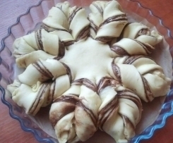 Ciasto dzielimy na 4 części, z każdą część wałkujemy w okrąg. Pierwszą część przekładamy na blachę wyłożoną papierem do pieczenia. Smarujemy nutellą, i tak samo z drugą i trzecią warstwą. Ostatnią warstwę kładziemy i już nie smarujemy nutellą. Na środku koła odciskamy lekko szklanką okrąg, który będzie nam pomocny w wycinaniu. Okrągłe ciasto kroimy na pół, później połówki na połówki tak żeby było 16 nacięć. Następnie jak poniżej wykręcamy do wewnątrz dwa kawałki i końce lekko podwijamy.