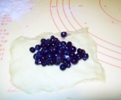 Na tak przygotowane kawałki ciasta nakładamy 2-3 łyżeczki jagód, zlepiamy bułeczki , smarujemy jajkiem ,następnie układamy na blasze do wyrośnięcia( ok. 15 min.)