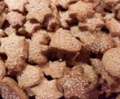 Ciasto podzielić na dwie części, rozwałkować i wykrawać ciasteczka foremkami do ciastek, najlepiej świątecznymi kształtami (grubości około 1 cm), posmarować pozostałym białkiem i posypać cukrem i sezamem.