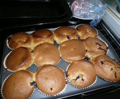 Mąkę wymieszać z proszkiem do pieczenia, solą, sodą i cukrem w osobnej misce. Jajka ubić - obroty 4 (ok 1min). Dodać rozpuszczone masło i razem wymieszać - obroty 1 (15sec) i dodać maślankę lub jogurt naturalny i znów wymieszać- obroty 1 ok 1min. Płynne składniki połączyć z sypkimi i wymieszać - obroty 3 (ok 1min 30 sec) Dodać mrożone jagody i wymieszać za pomocą plastikowej szpatułki. Wypełnić masą foremki do 2/3 wysokości. Piec 30 minut.